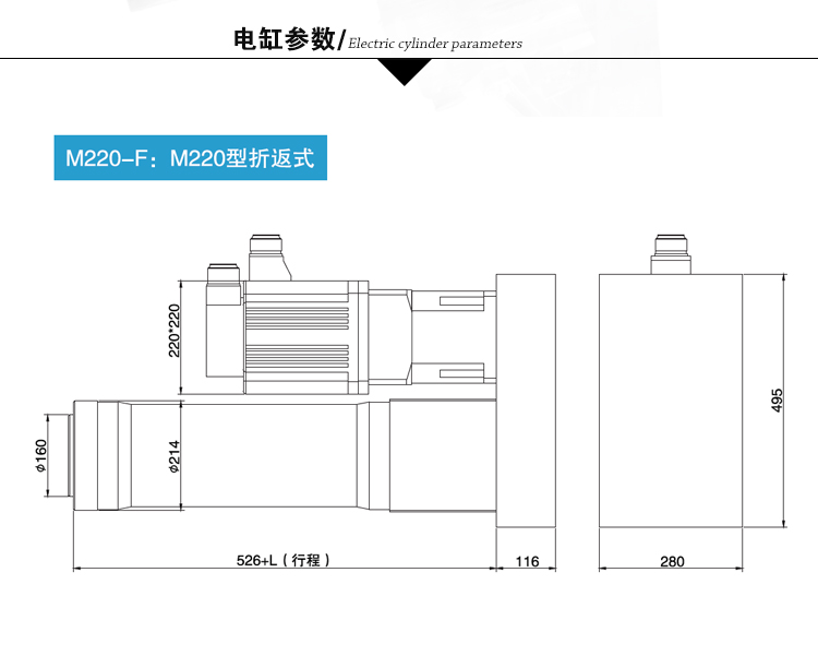 折返式伺服電動缸的電機與缸體平行安裝,電機通過高強度同步帶輪與電動缸的傳動絲桿相連接而帶動絲桿傳動,除具有直線式伺服電動缸的特點外,并由于整體長度短,適用于安裝位置比較小的場合。伺服電機與電動缸配合靈活、安裝容易、設定簡單、使用方便。另外折返式伺服電動缸選用的同步帶,具有強度高、間隙小、壽命長等特點使整個電動缸具有較高的控制性和控制精度。